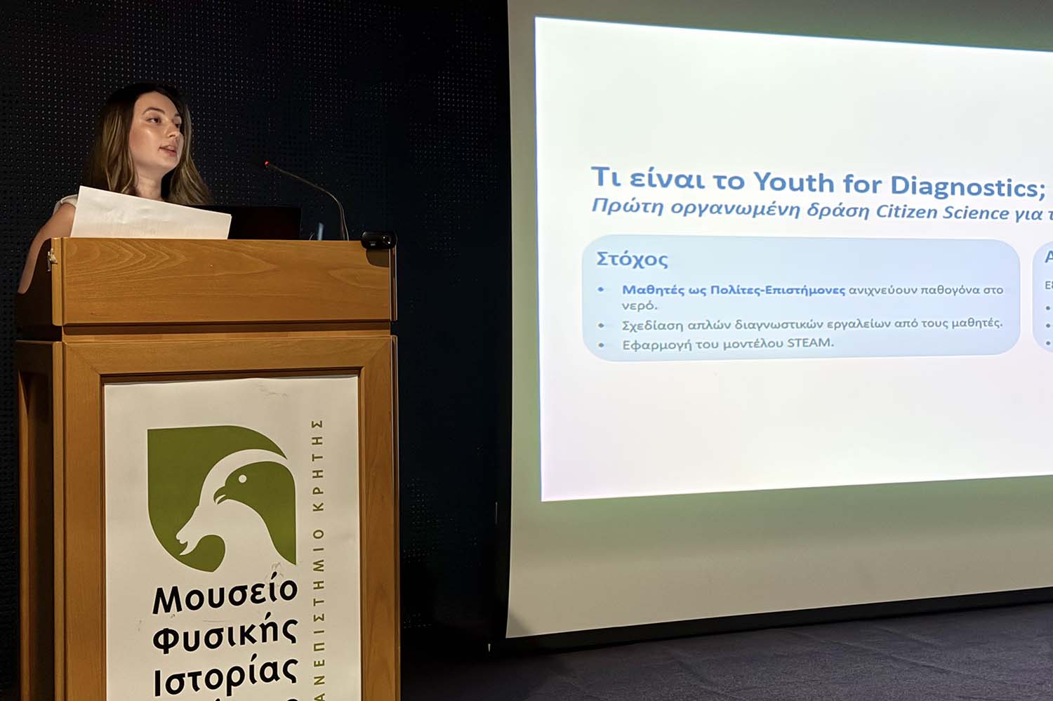 Το Σάββατο 22 Νοεμβρίου 2025 πραγματοποιήθηκε στο Μουσείο Φυσικής Ιστορίας η εναρκτήρια εκπαιδευτική ημερίδα της δράσης “Youth for Diagnostics”, με τη συμμετοχή 18 σχολείων, των ΕΚΦΕ Ηρακλείου και 40 εκπαιδευτικών από σχολεία μέσης εκπαίδευσης του Ηρακλείου. Στόχος της πρωτοβουλίας αυτής είναι οι μαθητές να ενταχθούν σε ρόλο επιστημόνων, προωθώντας την ενεργό συμμετοχή των πολιτών στην επιστημονική έρευνα.