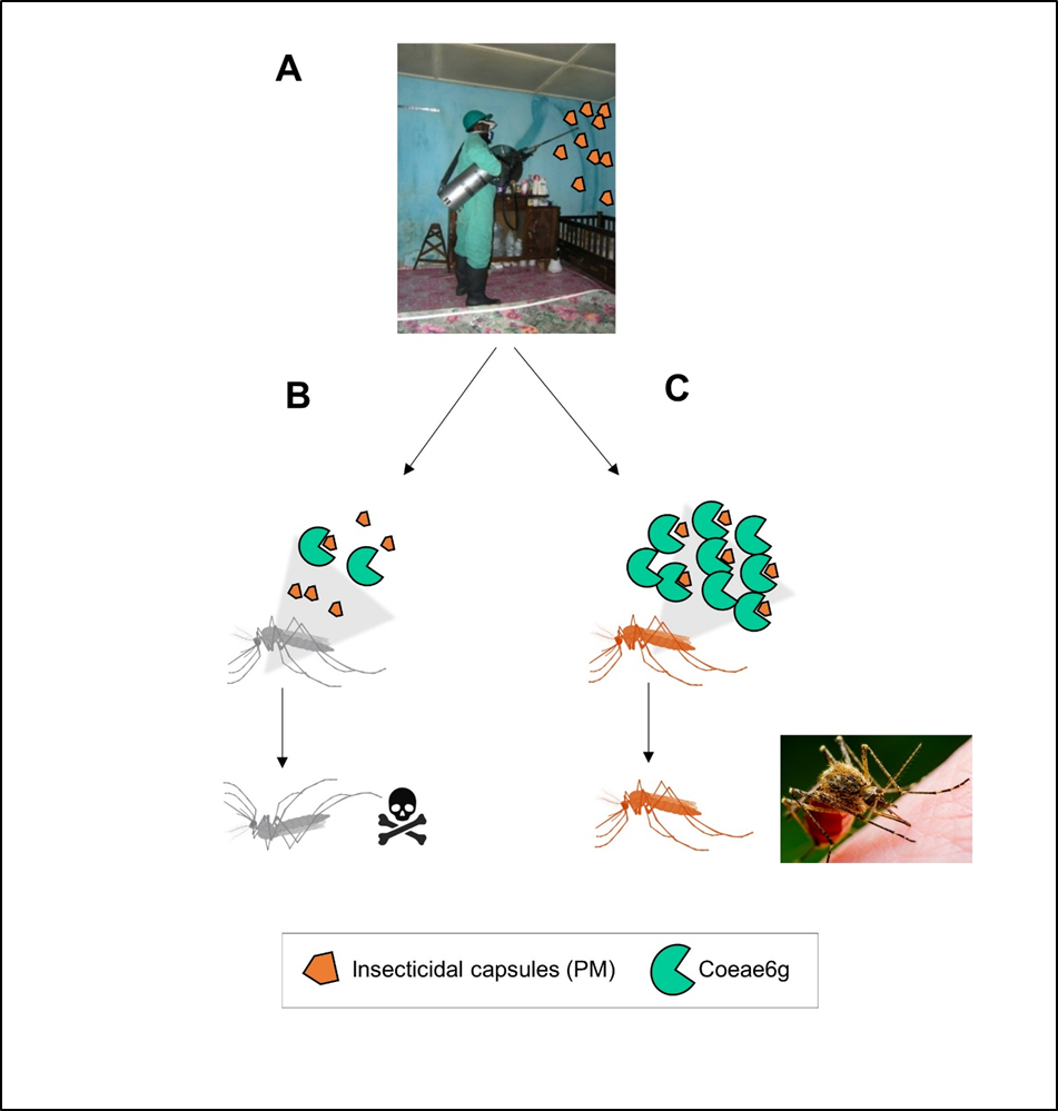 Figure 1. (A) Indoor residual spraying of household walls using new insecticide Actellic300S nanoformulations (PM). (B) Susceptible mosquitoes (gray) express low amounts of Coeae6g (green), and they tend to die upon exposure to PM. (C) Resistant mosquitoes (orange) over-express Coeae6g, that binds PM before it exerts its toxic effects. Mosquitoes stay alive and are able to blood feed on humans.